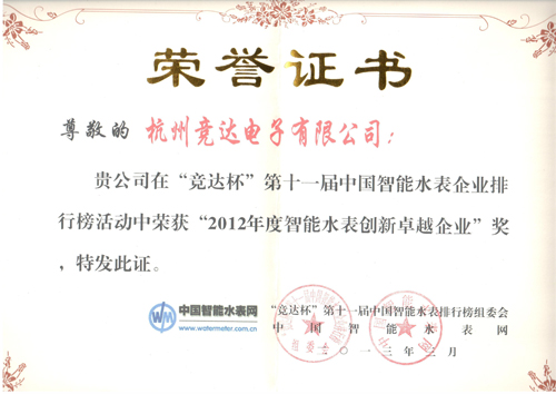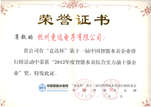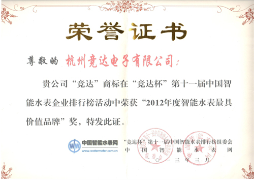 在上周剛剛揭幕的“第十一屆中國智能水表企業(yè)排行榜”中,本司喜獲三個獎項,分別為“2012年度智能水表綜合實力前十強(qiáng)企業(yè)”、“2012年度智能水表*具價值品牌”、“2012年度智能水表創(chuàng)新卓越企業(yè)”。住建部及中國計量研究院領(lǐng)導(dǎo)曹世來、曲福順、李旭等分別為我司頒發(fā)了獎狀。